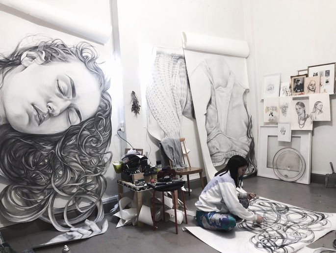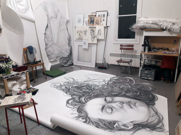 According to Greek Mythology, Gaia, from ancient Greek “Γαία”, is the initial deity of Earth and personifcation of life. Using exclusively paper and charcoal, I created the image of a giant woman sleeping. A mythological and modern figure, she sleeps in the city center between concrete buildings but no one bothers her.
